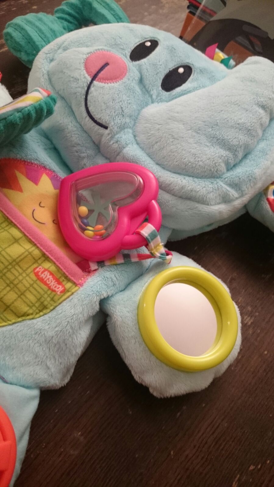 Dans la main gauche vous retrouverez un miroir, son petit ventre cache une poche avec un petit coeur à mordre, ses jambes présentent différentes textures faisant des sons amusants pour l’enfant…